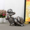 This image showcases a handcrafted brass statue depicting a cow with a baby Krishna resting on its back. The statue features intricate detailing, including a raised relief of Ganesha on the cow’s back.