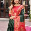 Step into tradition and elegance with this Dark Green Dola Silk Lehenga Choli, beautifully complemented by a contrasting Red Dola Silk blouse. Crafted from premium Dola Silk, the lehenga features intricate Bandhej and Ajarakh print work, stitched with canvas and Can-Can for a grand 3.8-meter flair.