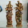 This set of two brass statues depicts a man playing a flute and a woman holding a lotus flower. The statues are likely inspired by Hindu deities, possibly Krishna and Radha, although they lack some of the defining attributes, such as the peacock feather crown Krishna is typically depicted wearing. The statues are made of brass and have a polished finish.
