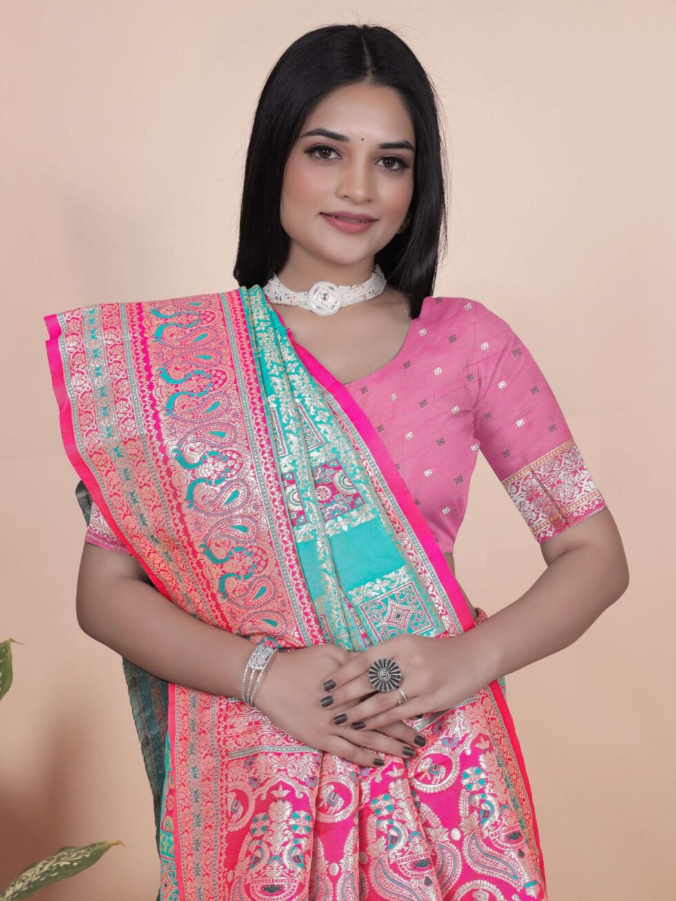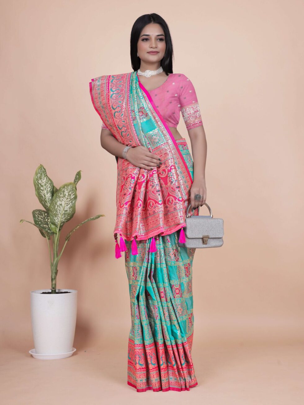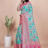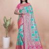 Add vibrancy to your ethnic wardrobe with this Aqua Blue and Pink Banarasi Silk Saree with Silver Zari Weaving, a masterpiece that blends tradition with sophistication. The aqua blue silk base is beautifully adorned with structured silver zari block motifs, adding richness and subtle shimmer to the body.