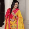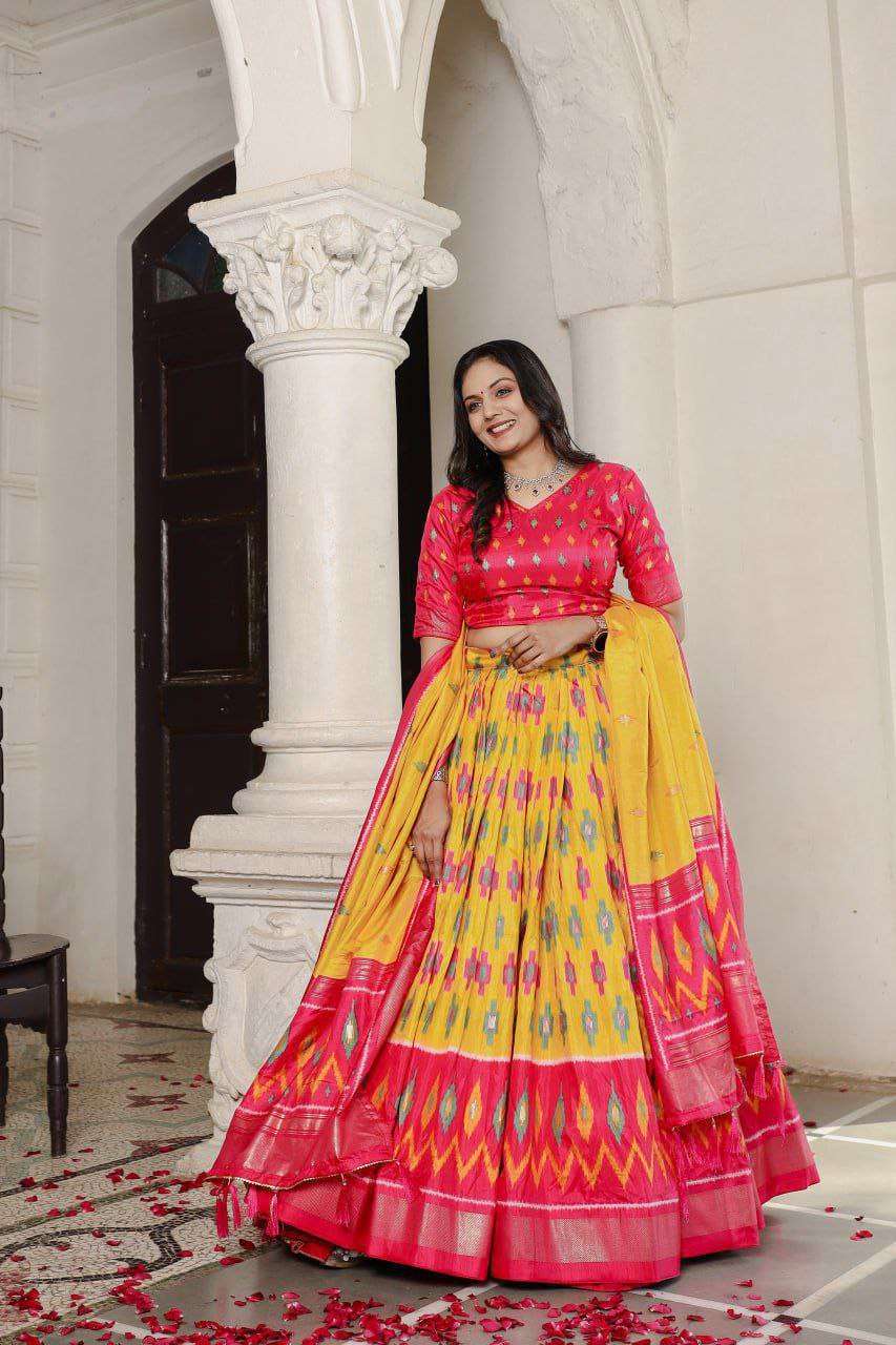 Celebrate vibrant tradition with this Yellow Dola Silk Lehenga Choli, beautifully complemented by a Red Dola Silk blouse. Crafted from premium Dola Silk, the lehenga showcases exquisite Patola print and foil work detailing, stitched with canvas and Can-Can for a voluminous 4-meter flair.